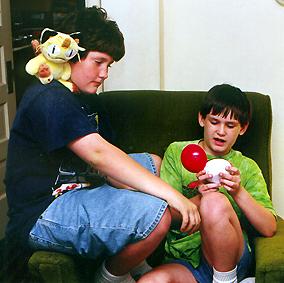 Joe’s friend, Brandon Scott, spends a lot of time at our house these days, especially during summer vacation. Brandon has a Poké Ball game, which Joe is playing in this picture. Joe’s plush Meowth is resting on Brandon’s shoulder.