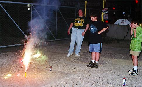 Wendi, Brandon and Joe watch as a fountain shoots sparks of various colors.