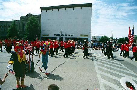 Here, a marching band is accompanied by some clowns passing out candy to the children.