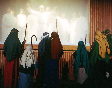 Shepherds, watching their flocks at night, are startled by a host of angels proclaiming the birth of the baby Jesus.