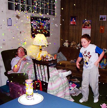 I made breakfast for lunch, about 12:30: citrus-spice pancakes (using Sunny Delight®) and thick-sliced bacon. Joe’s other friend came back at about 1 p.m. and had a pancake too. Then Wendi let him set off the second table bomb, in the living room. This one really blew! Confetti and toys flew all over. This time, I caught it on film.