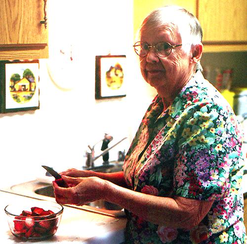 Wendi’s Aunt Jo invited us to her apartment for lunch on Sunday. Here she is, slicing strawberries for lunch (they were delicious!). We also ate burgers with fried onions, tomatoes, cucumbers, pickles and chocolate cake for dessert. I made a royal pig of myself!