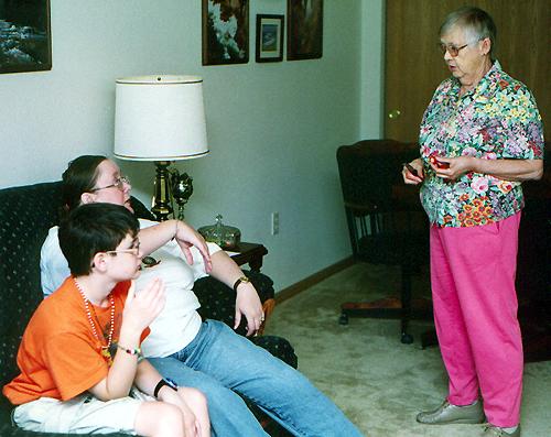 Aunt Jo pauses from preparing lunch long enough to chat with Wendi and Joe for a minute.