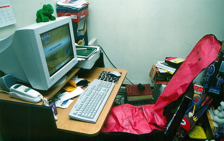The paper mummy sitting at the computer is one that Joe and three other students constructed last spring, when Joe was in the sixth grade.