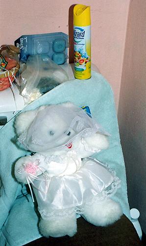 The bride bear is seen here sitting on the TOILET!