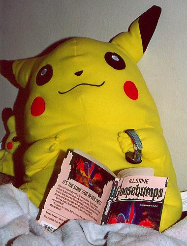 Pikachu is seen reading a Goosebumps book.