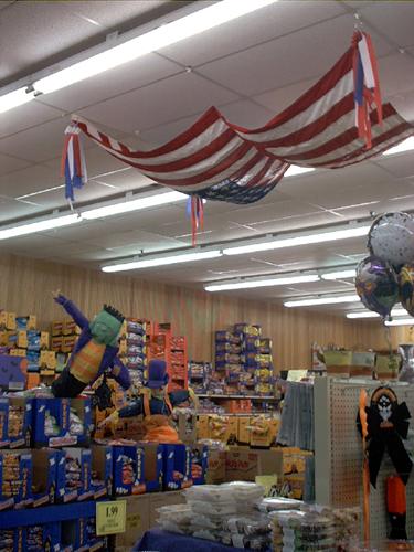 Not far from the store’s front entrance, an American flag hangs from the ceiling near a large display of Halloween candy, cookies and decorations.