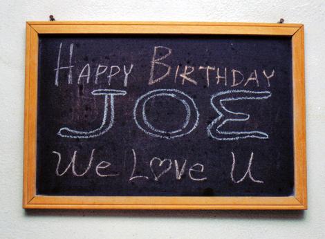 Chalkboard message reads “Happy Birthday Joe—We Love U” (January 17, 2002)