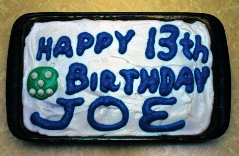 Homemade birthday cake is decorated with the words “Happy 13th Birthday Joe” in blue letters on white background. A crude Ummamum face (in green frosting with white chocolate chips) provides a zany accent.