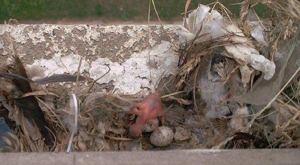 June 27, 2002: Our air conditioner was out for repairs. Some sparrows had built a nest in the window sill, beneath the air conditioner. Today afforded me a rare opportunity to photograph a baby sparrow and two eggs in the nest.