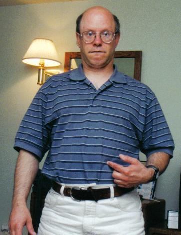 “Who—me? I’m just the Ummamum Guy!” Charlie points at himself innocently while making the Ummamum face. Taken June 19, 2002 at a motel in Green Bay.