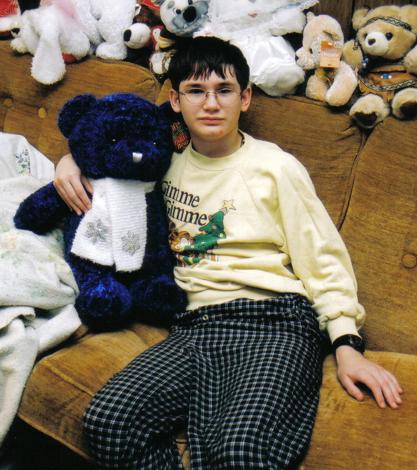 Joe is up early on Christmas morning, still in pajamas, hugging a Christmas bear.
