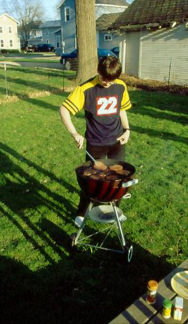 We had our first cookout at the new place on Tuesday, April 22. Here Joe is turning the burgers on the Weber grill—the first time he has ever done so.
