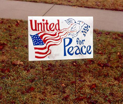 This sign’s message is clear—or is it? Are they opposed to the war, or are they in favor of it in order to ensure peace in the region?