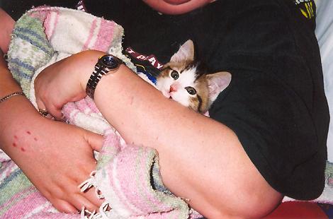 Wendi holds Shadow in a blanket. Taken April 27.