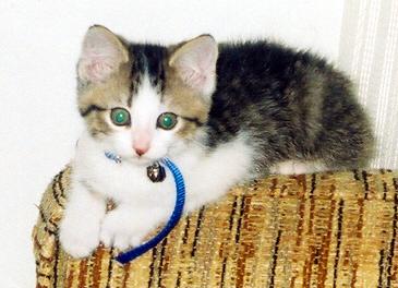 Uh-oh! Our kitty has green eyes! Well, not really: the green eyes are the result of on-camera flash. Humans get red eye; cats get green eye.