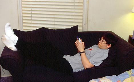 Joe relaxes on the sofa with his Game Boy (March 19).