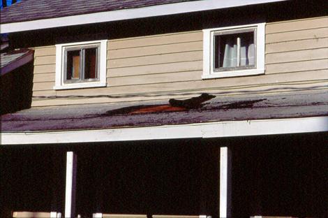 I finally took a good look at our porch roof, which had been damaged by the wind storm on May 11. Taken May 13 at 8:00 a.m.