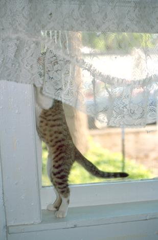 Shadow stands up on tiptoe on the mud room window sill, probably trying to catch a bug.
