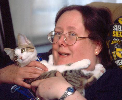 Wendi holds Shadow in the recliner in the living room. Shadow’s interest appears to be elsewhere.