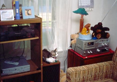 Here is another place Shadow likes to rest: on top of one of our stereo speakers in the living room. Taken July 5 at 7:22 p.m.