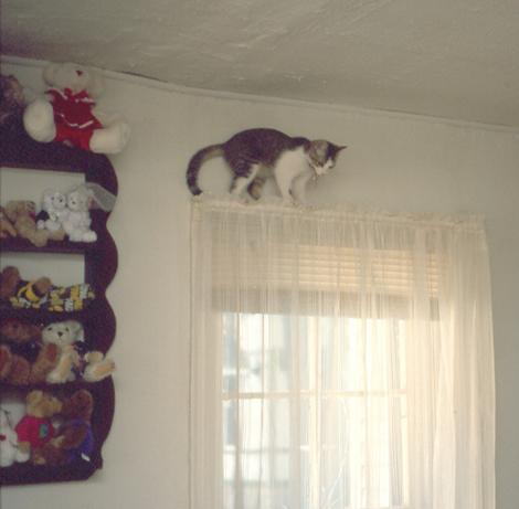 Shadow is the adventurous sort; she likes to climb curtains. Here she is, triumphantly strutting across the top of a curtain rod in our dining room. (July 12 at 12:06 p.m.)