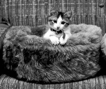 Shadow looks intently toward the camera, from her bed, with her front paws on the edge of the bed. (May 7 at 3:18 p.m.)