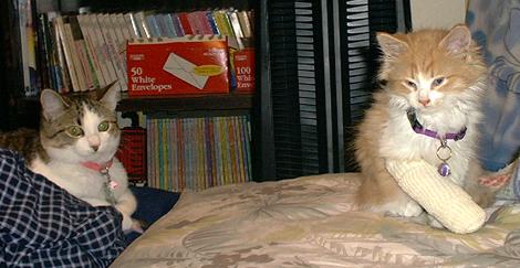 A minute later the two kittens were seen sitting peacefully together on our bed. Somehow I managed to get this picture with both of them looking at me.