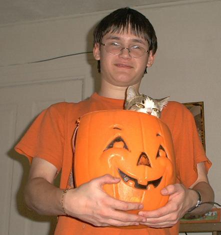 Shadow peers out from inside a plastic Halloween pumpkin that Joe is holding, October 8 at 10:09 p.m.