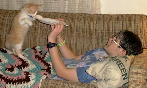 Joe and our youngest kitten, Sunny, play tug-of-war with a sock. (October 17, 10:41 p.m.)