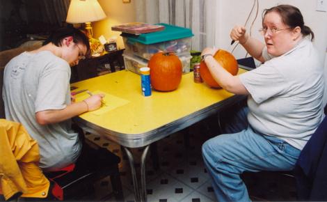 Wendi begins carving a pumpkin and Joe intently draws a design for another.