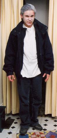 With his slicked-down, whitened hair, pale skin, dark jacket and pants, and vampire teeth, Joe makes a pretty convincing Spike (from Buffy the Vampire Slayer).