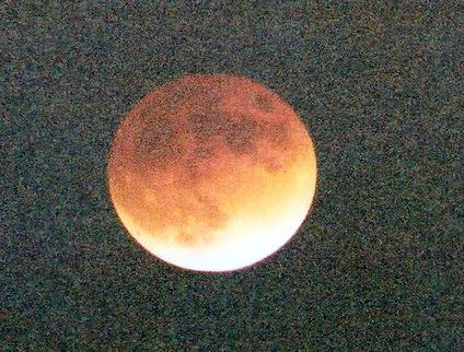 On Saturday, November 8, at about 7:30 p.m. I took this photo of the moon, using a 300-millimeter lens and 2× teleconverter on a 35-millimeter camera. A lunar eclipse was in progress; the shot was taken just before the end of the total phase (image is cropped).