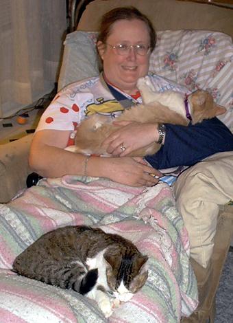 Both of our kittens—Sunny (tan-colored) and Shadow (grey tabby) fell asleep on Wendi’s lap at home. (November 28, 11:18 p.m.)