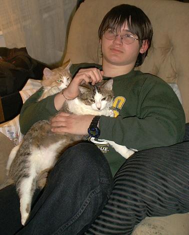 Joe relaxes with both of our kittens, Sunny and Shadow, in the recliner in the living room. (December 11, 8:19 p.m.)