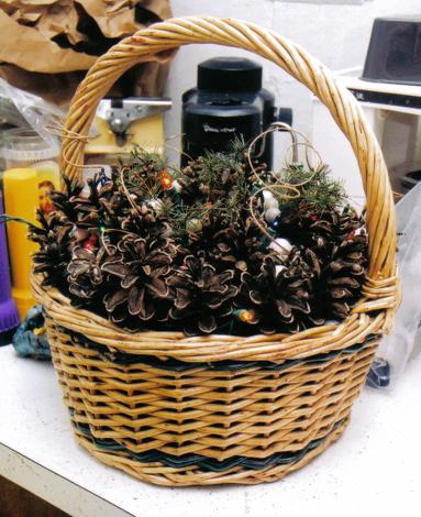 Someone gave us a wicker basket full of decorated pine cones. It lights up when you plug it in!