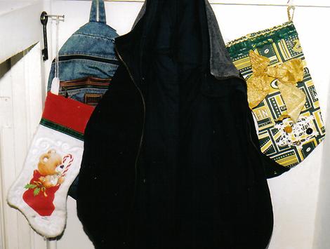 More stockings are hung at the foot of the stairway.