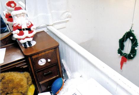 Overlooking the stairway from Joe’s bedroom, a Santa Claus figure on Joe’s dresser can be seen, as well as a crocheted wreath on the stairway wall.