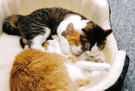 Close-up of Sunny and Shadow sleeping in the bed, March 2.