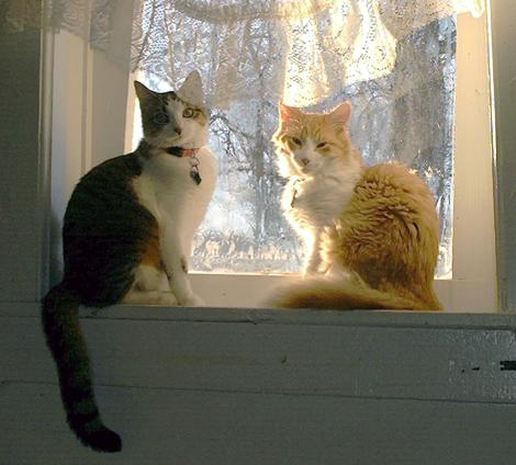 Shadow and Sunny in the mud room window, January 19 at 8:14 a.m.