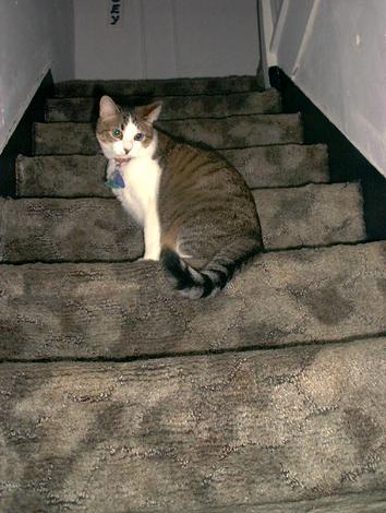 Here is a nice picture for Halloween: a scary shot of Shadow on the stairway. (October 10 at 8:04 p.m.)