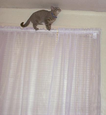Stormy triumphantly walks across the top of the curtain rod. (October 10 at 1:53 p.m.)