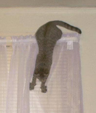 One would think she had learned her lesson but NO! Again and again she climbs up and down the curtain until she tires out and lies down to sleep.