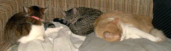 Less than an hour later, all three cats lie asleep on the sofa: from left to right, Shadow, Stormy and Sunny (November 14, 2004 at 6:09 p.m.).