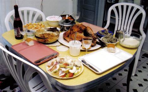Dinner (2 p.m.) included turkey, stuffing, mashed potatoes with turkey gravy, green bean casserole, corn, apples and pears with fruit dip, dinner rolls, fruit salad with Cool Whip, cran-raspberry jelly, sweet potatoes, deviled eggs, and sparkling Cold Duck to drink. Pie later with French Vanilla Cool Whip.