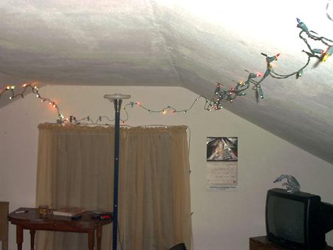 We only put up one Christmas tree this year (we have two) so we didn’t use all of the lights and garland. Joe found a use for the lights in his bedroom. Taken December 24, 2004 at 12:57 a.m.
