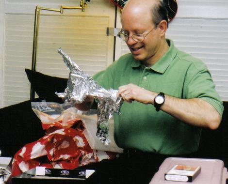 Christmas morning, 2004: There are several more layers of wrapping inside of this package: aluminum foil, plastic wrap, a plastic storage bag…
