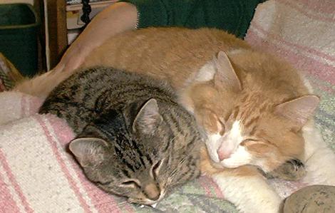 Stormy, our grey-and-silver kitten, sleeps next to Sunny, our big orange-and-white cat, on Wendi’s lap. Taken December 14, 2004 at 8:10 a.m.
