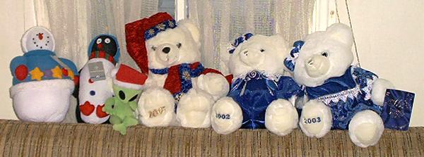 There is quite an array of Christmas bears and other plush critters on the back of the sofa. Taken December 14, 2004 at 8:11 a.m.
