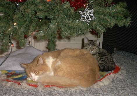 But this shot is even cuter: Sunny and Stormy are both asleep, right under the Christmas tree! Taken December 17, 2004 at 4:39 p.m.